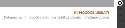 pomeni, da izbranemu dokumentu ne moremo spreminjati podatkov, ker je že obdelan v računovodstvu. Takemu dokumentu lahko urejamo/popravimo le podatke za izvedbo plačila (zavihek Plačila).