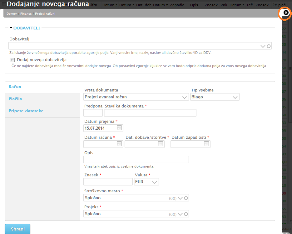 S klikom na + v vrstici menuja, se nam odpre maska za vnos prejetega računa. Za preklic vnosa, kliknemo na X.