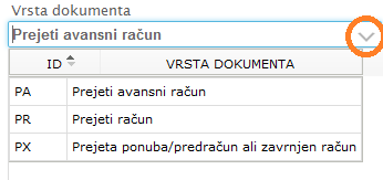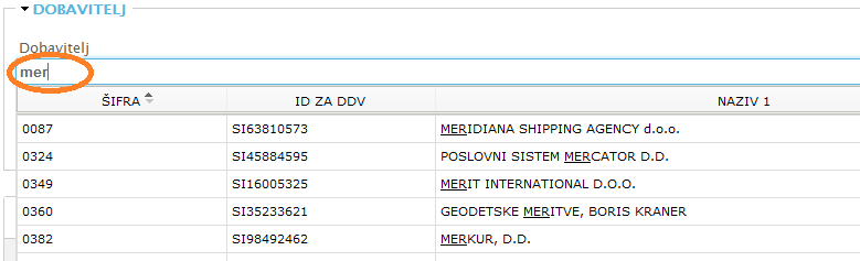 Dobavitelj - V prostor za vpis, vpišemo del ali celoten naziv, naslov ali davčno številko. Izberemo dobavitelja iz seznama. Velikost črk ni pomembna.