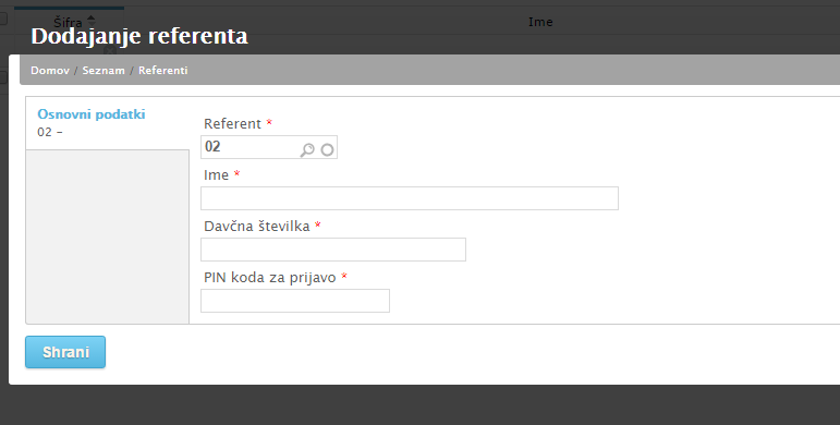 S klikom na + na desni strani se nam odpre novo okno kjer vnesemo podatke novega referenta.